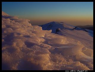 La nieve venteada siempre adopta formas características, parecen olas que a la puesta de sol se anaranjan para apagarse después lentamente camino de la hora azul.